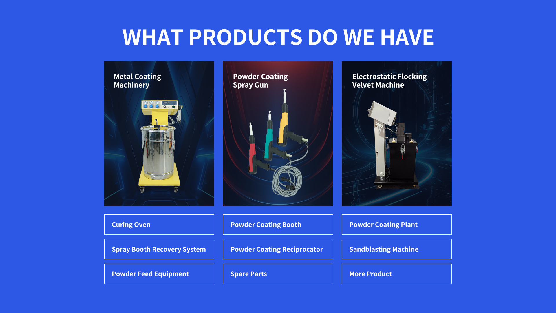 Powder coating equipment includes electrostatic spray guns, curing ovens, powder recovery systems, and pretreatment stations.